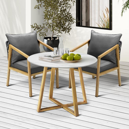 Designer 3pc Marble Stone Style Table and Chair Outdoor Set | Soft Cushioned Chairs and Table Patio Furniture Set in Four Models